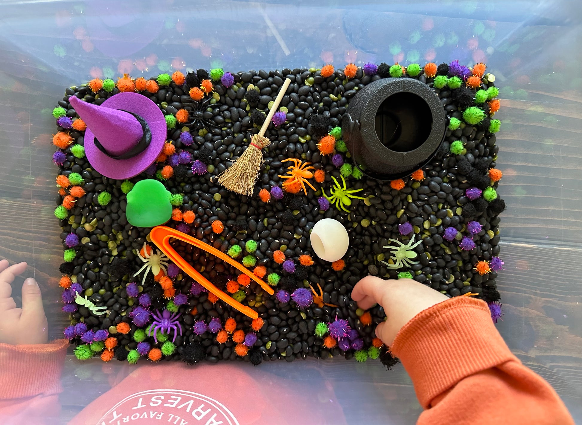 • 8 cups of sensory base – a mix of dried beans perfect for scooping, pouring, hiding, and counting creepy treasures.