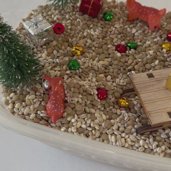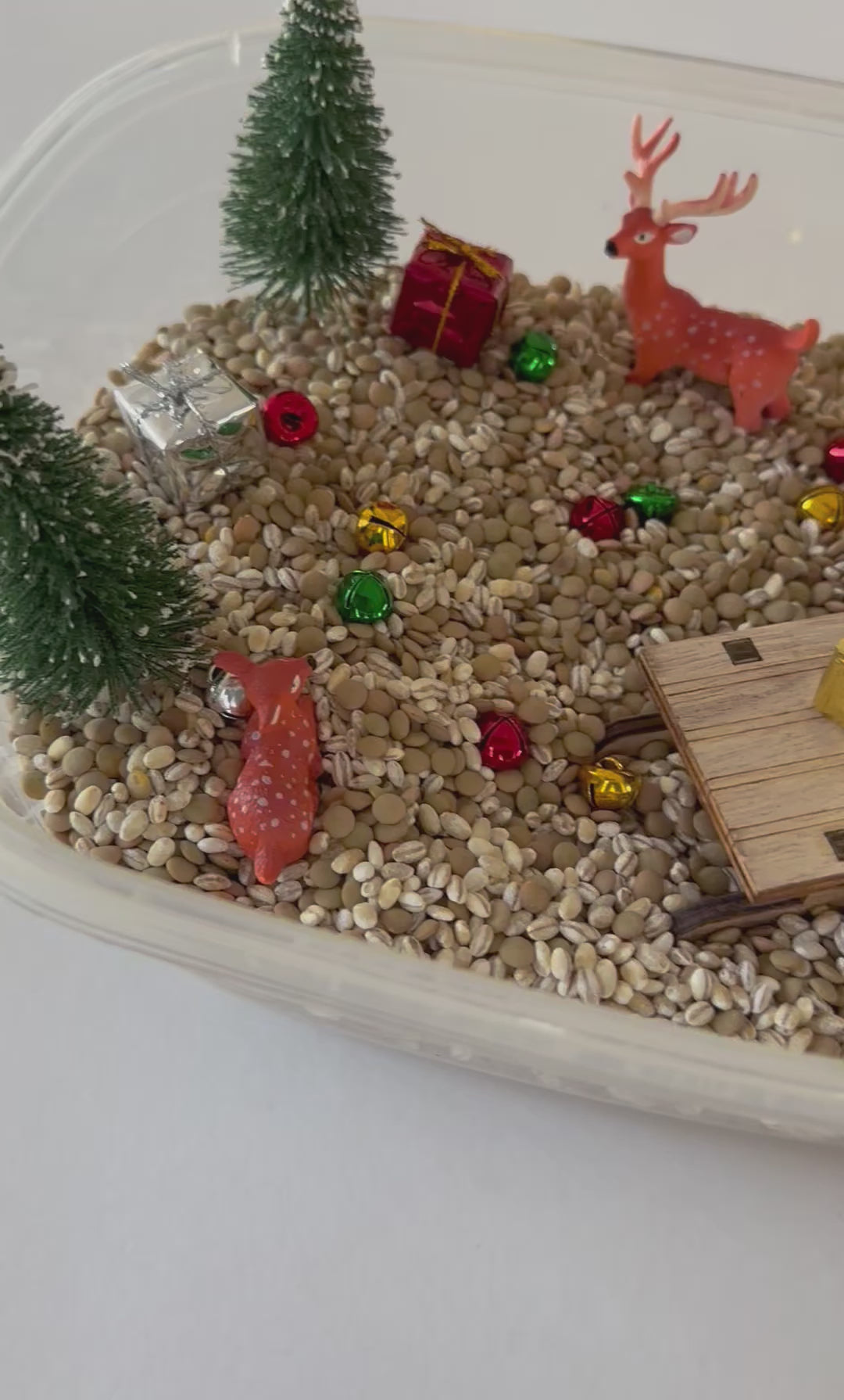 • 3 cups of sensory base – a cozy blend of lentils & barley, perfect for scooping, pouring, sprinkling “snow,” and setting the scene for Santa’s big night.